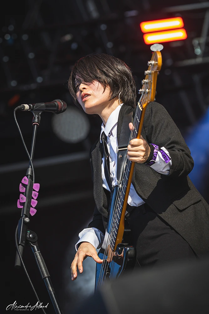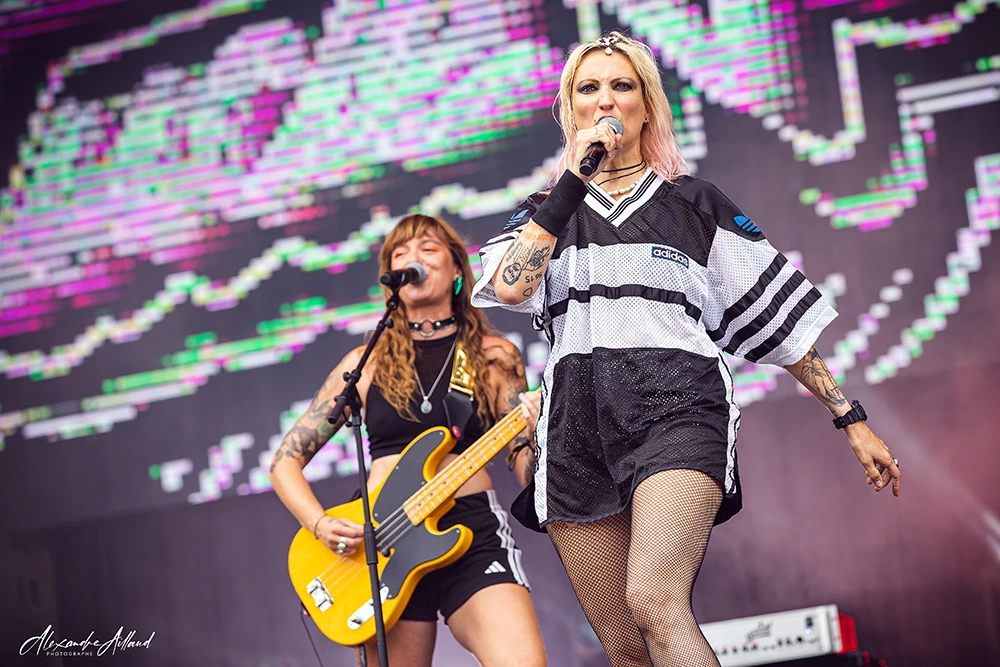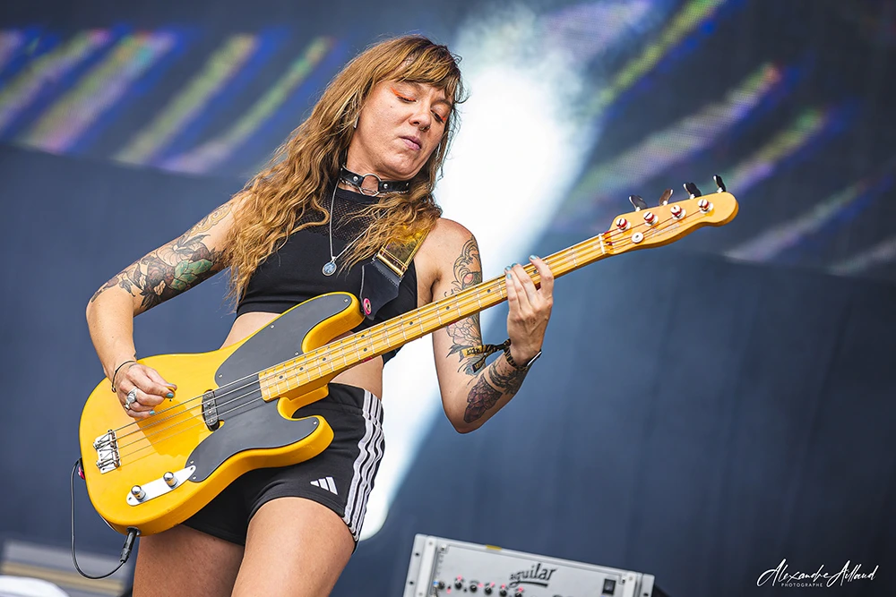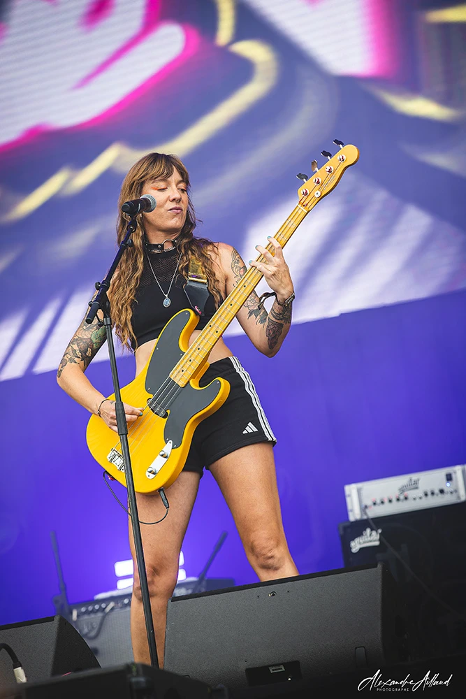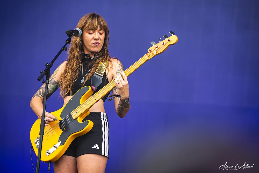 Sous un ciel encore timide, une silhouette surgit sur la Mainstage 1 avec sur les épaules une tenue de hockeyeur et une Flying V en bandoulière. LUCIE SUE, rockeuse basque à l’univers aussi mordant qu’attachant, débarque avec aplomb. Et d’entrée le ton est donné : entre second degré assumé et riffs bien placés, on sent qu’on ne va pas s’ennuyer.