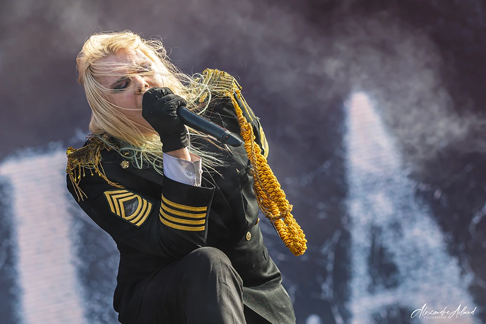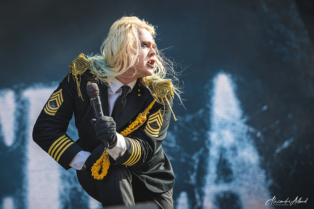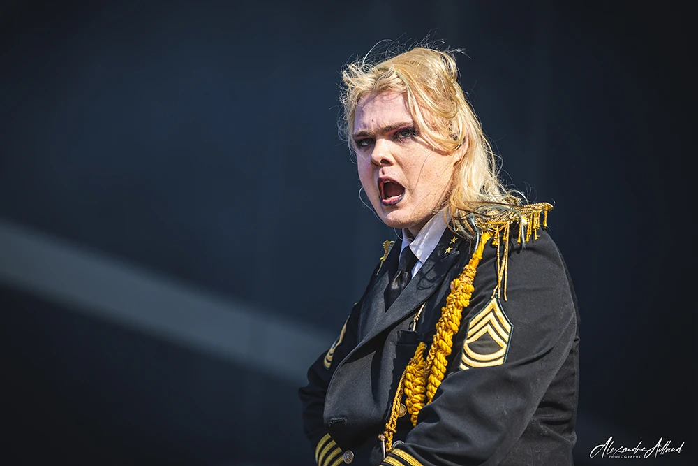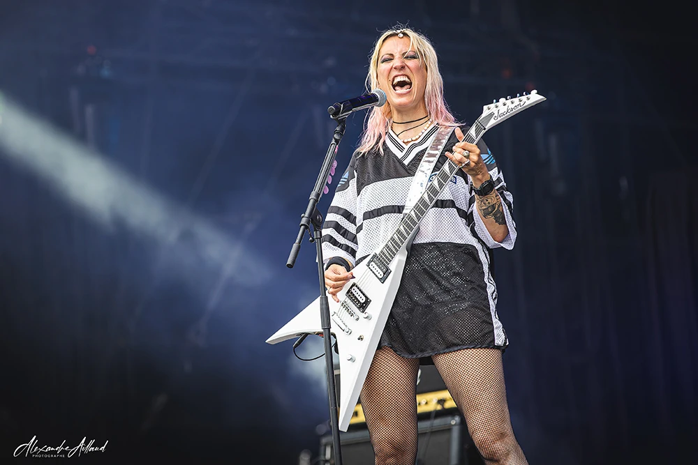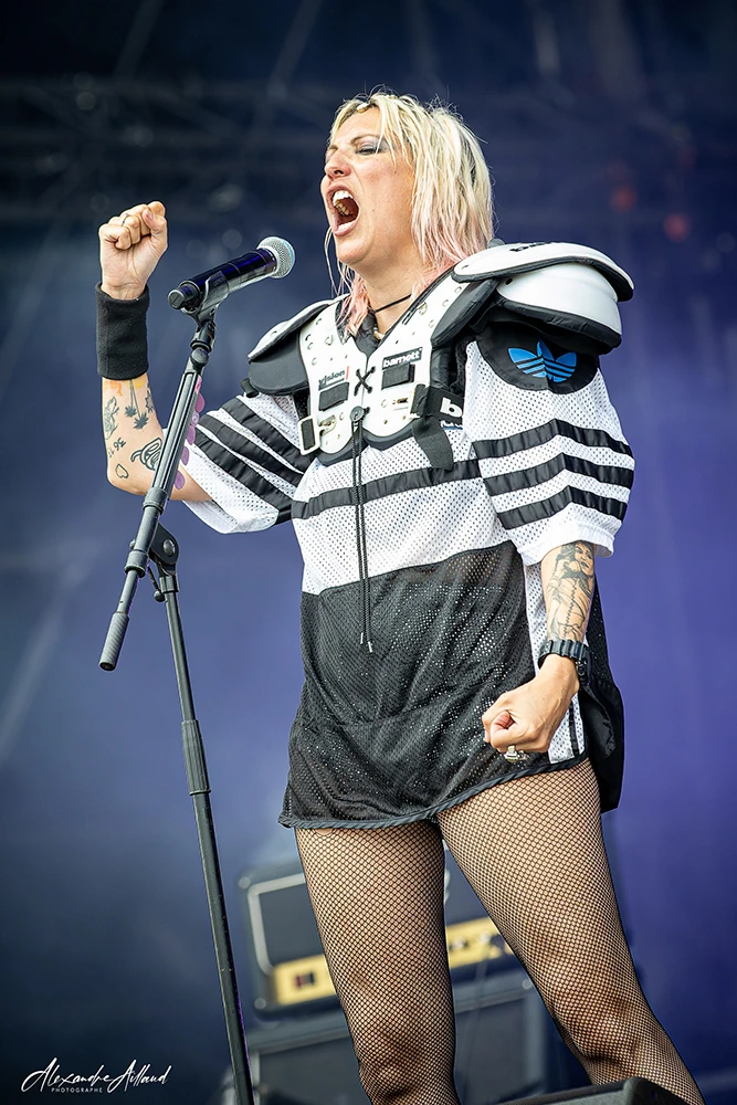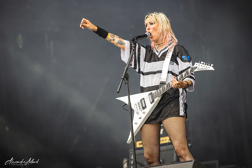 Elle nous rappelle, sourire aux lèvres, son passage improbable sur cette même scène avec STEEL PANTHER quelques éditions plus tôt. Un souvenir un peu fou qui contraste joliment avec la maturité de sa proposition actuelle. Car aujourd’hui, c’est bien son nom qui s’affiche à l’arrière sur l’écran géant, et son univers qu’elle impose sans forcer.