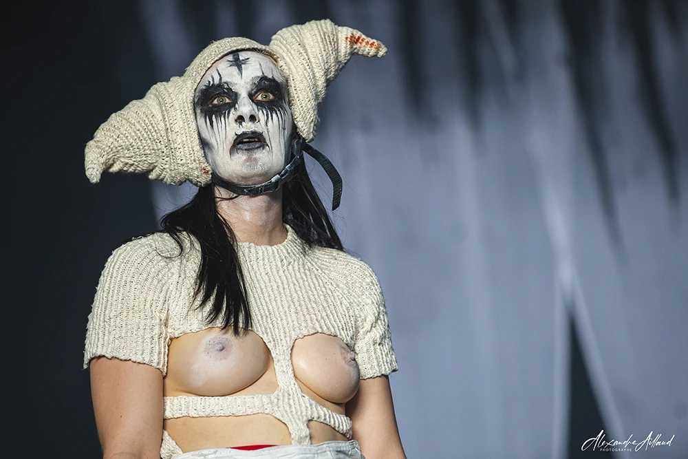 À mi-parcours, le rituel prend un tournant. Elles reviennent torse nu, pantalon rouge, perruques noires ruisselantes et corps maculés de faux sang. L’impact est total. Entre violence cathartique et performance symbolique, leur art devient cri de révolte féministe. Et comme pour briser définitivement la barrière scène/public, elles terminent le set en se jetant dans la foule.