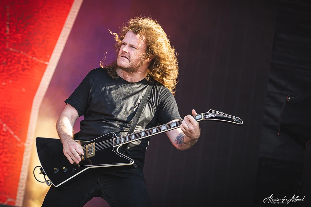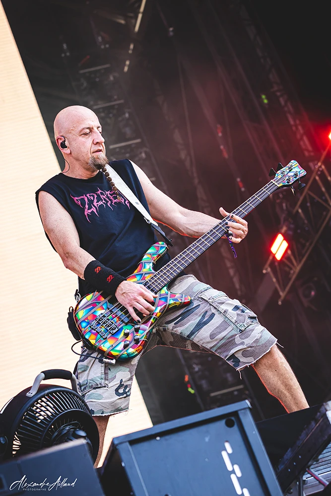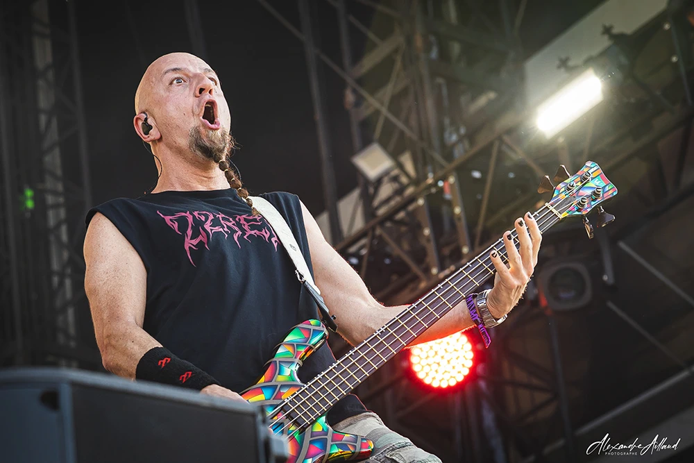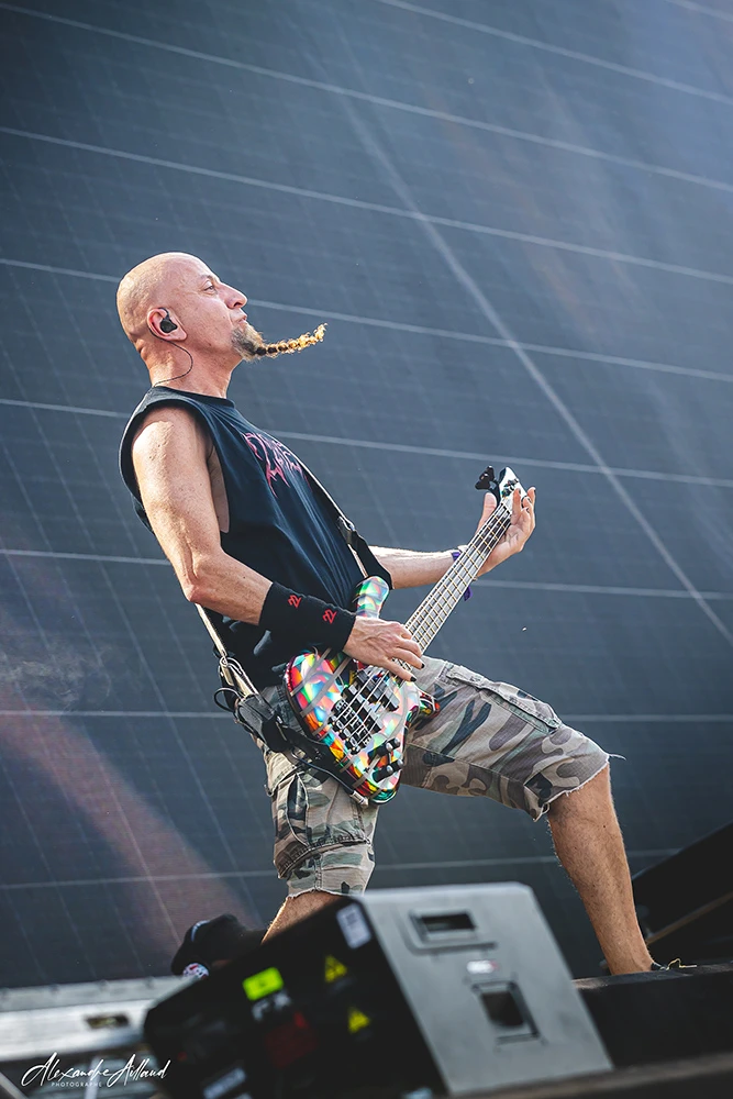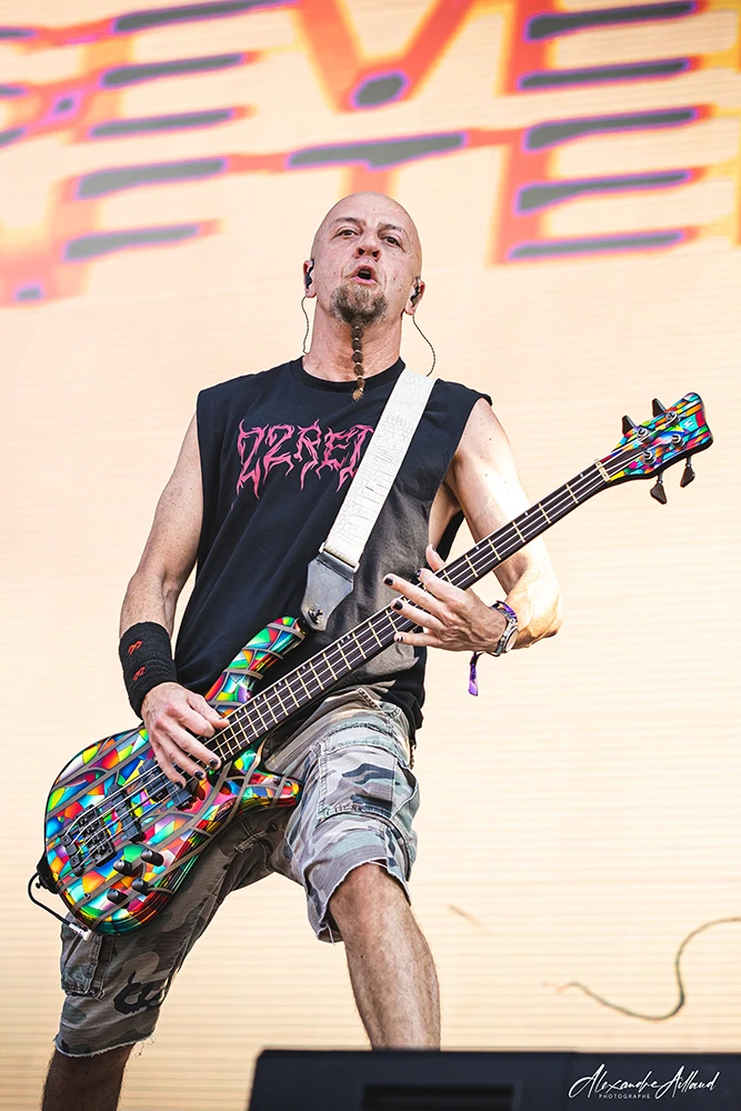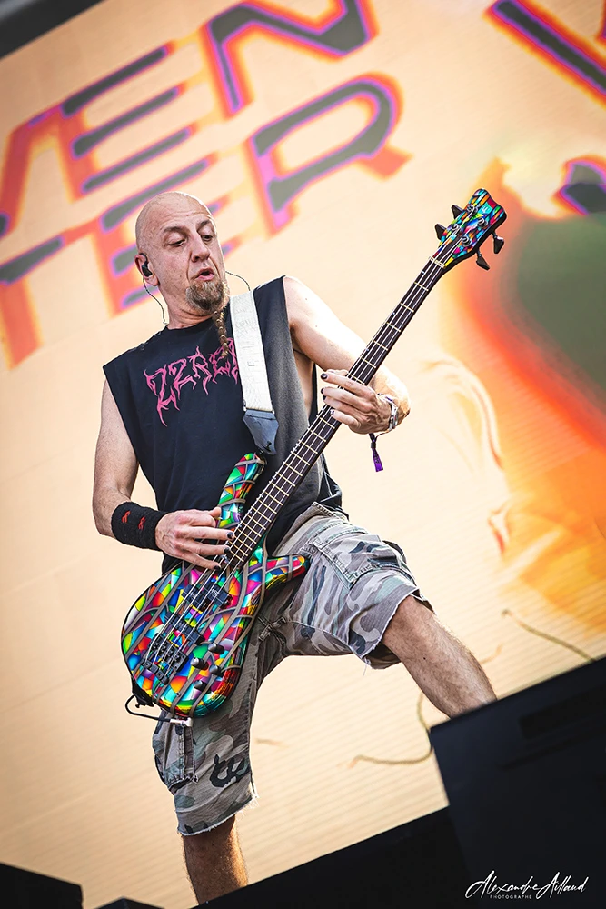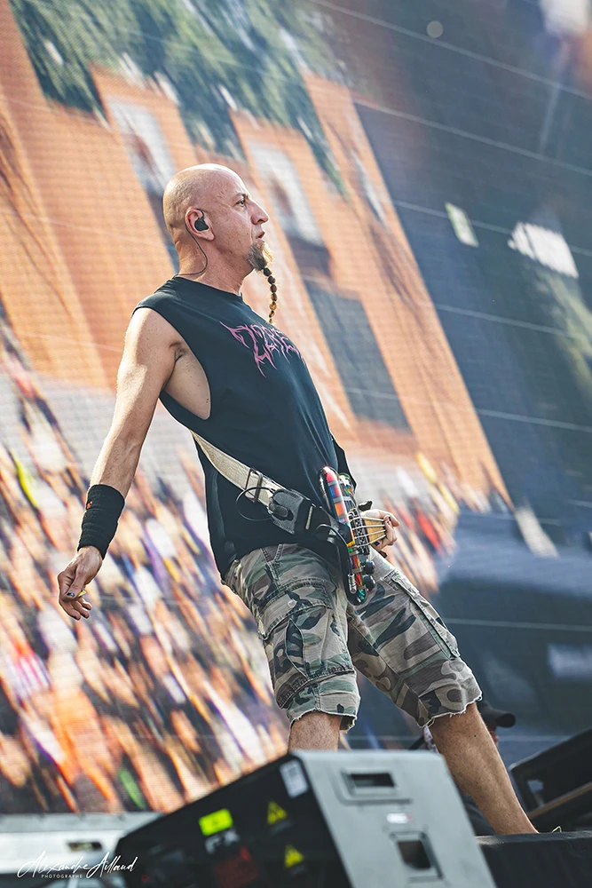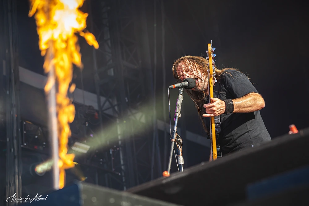 « Necessary Evil » et « Slaughterhouse » installent une ambiance plus crasseuse et agressive, avec leurs refrains martelés en chœur par le public. Le groupe déroule comme un bulldozer, alternant violence pure (« Voices », « Disguise ») et moments plus fédérateurs. L’apothéose arrive avec « Scoring the end of the World » : pluie de feu sur scène, poings levés, sensation d’assister à un générique de fin apocalyptique en direct.