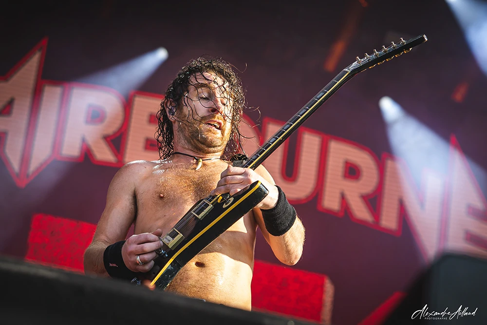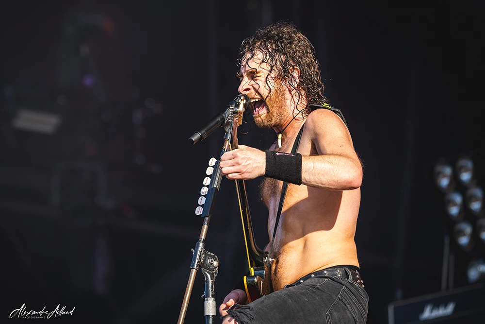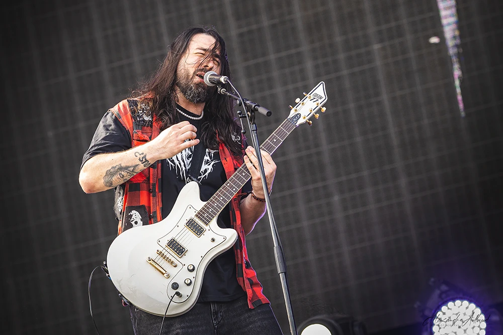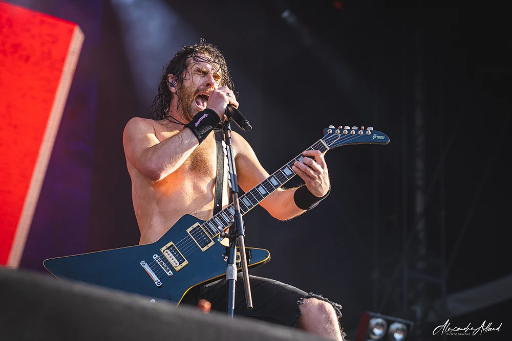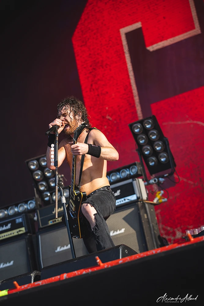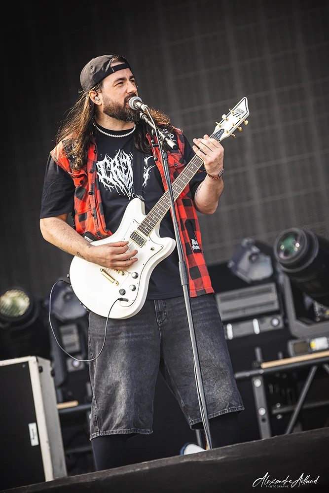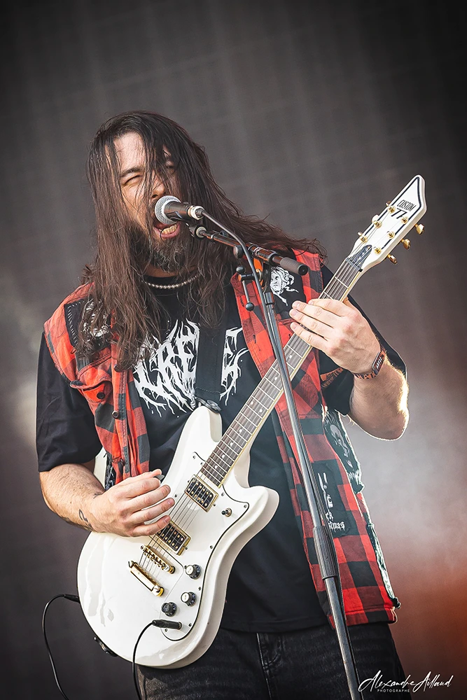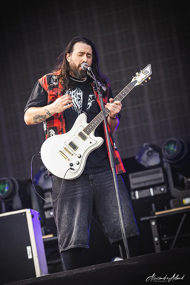 ASHEN ne se contente pas d’ouvrir la journée : ils la font exploser. Les Parisiens, qui ont récemment repoussé la sortie de leur premier album Chimera au mois de septembre, n’en affichent pas moins une confiance et une maturité scénique impressionnantes. Leur Metal moderne, technique et incisif, déferle sur le public entre riffs compressés et rythmiques dévastatrices. Clément, frontman charismatique et infatigable, arpente chaque centimètre de l’avancée de scène, galvanisant les premiers rangs, hurlant ses refrains le regard planté dans les yeux des fans.