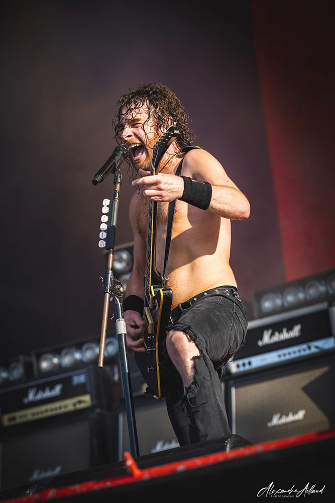 Pas de préliminaires. « Let me out » ouvre les hostilités comme un coup de masse. Étienne, silhouette irradiée et regard brûlant, mène le chaos avec l’assurance d’un prêcheur apocalyptique. « Kill your god », « Life and choices », « Traders must die« … chaque titre est un ordre, chaque riff un électrochoc qui secoue le pit. Les circle pits s’enchaînent sans répit, les slams pleuvent et même les plus réticents finissent aspirés par la tornade.