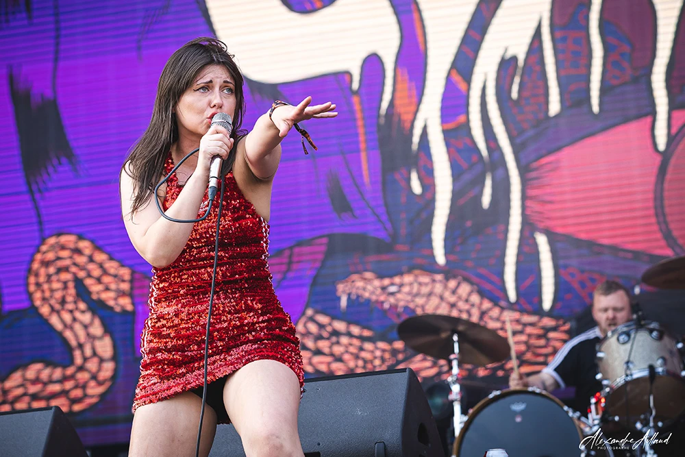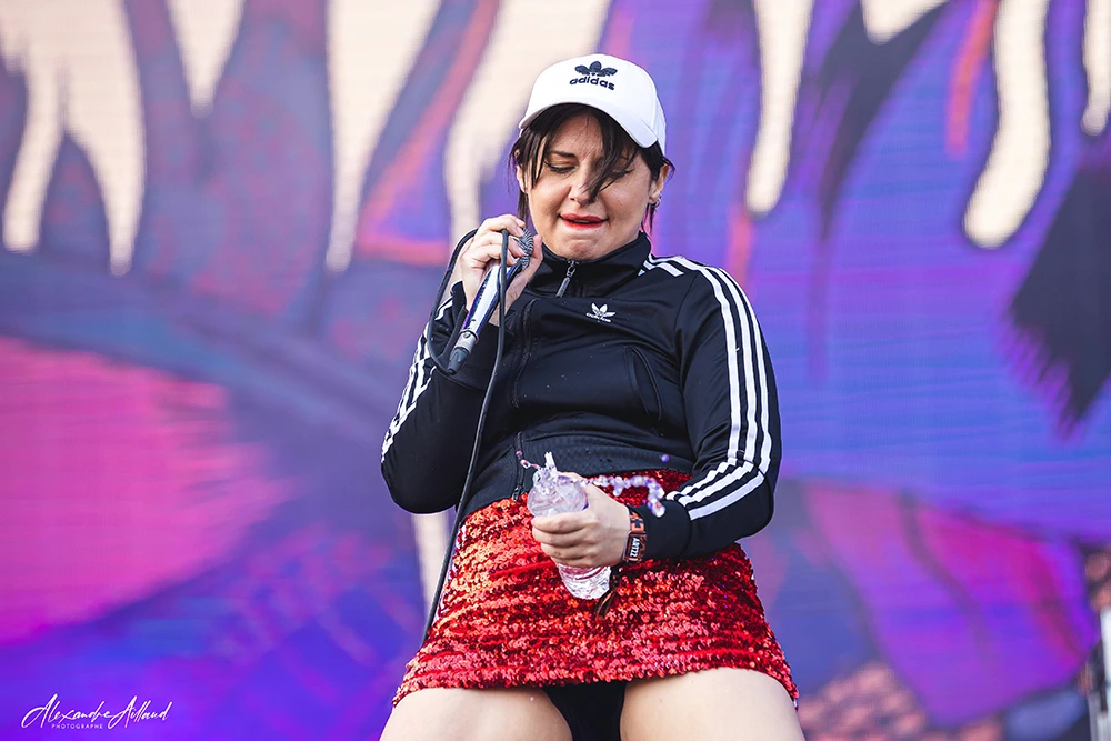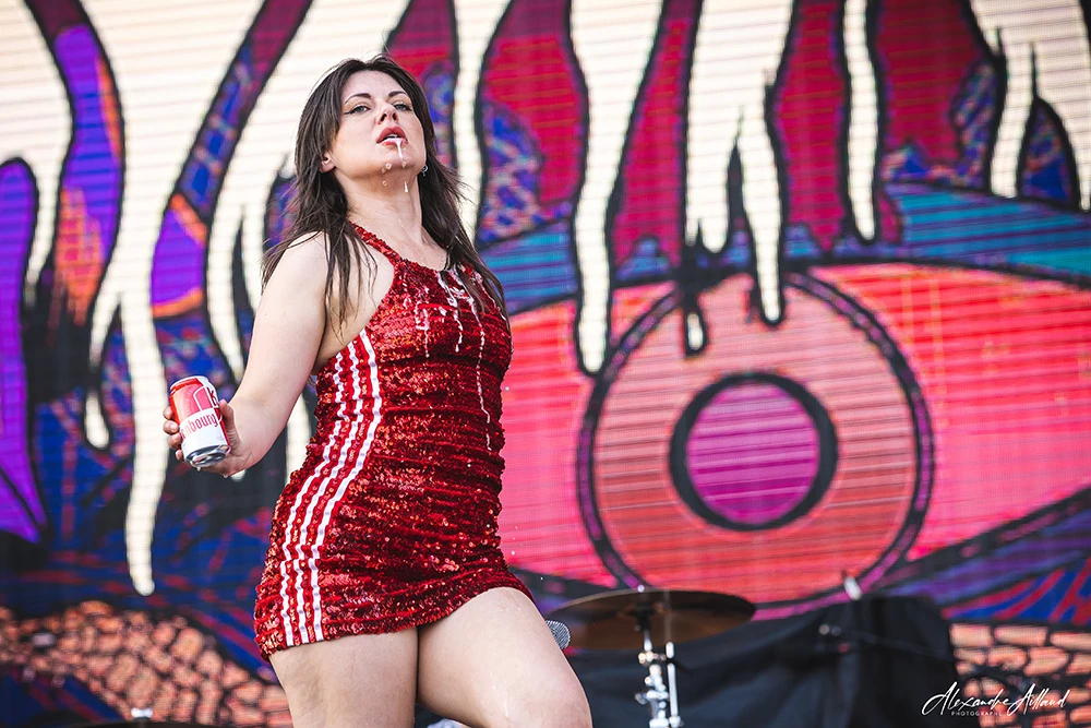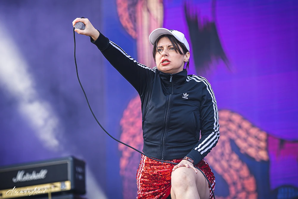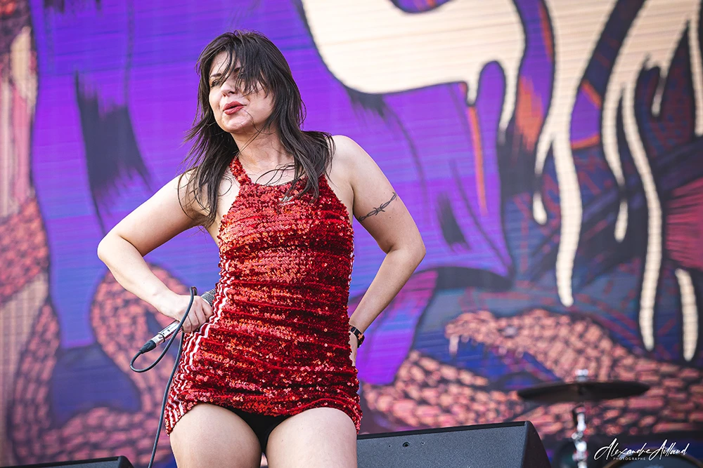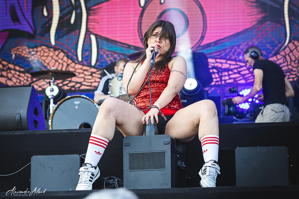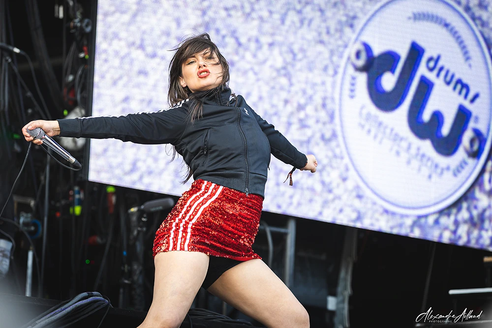 Son attitude est un mélange d’anarchie pure et de contrôle millimétré. Entre roulades, déhanchements, gestes provocateurs et hurlements post-hardcore, elle transforme chaque morceau en déflagration.