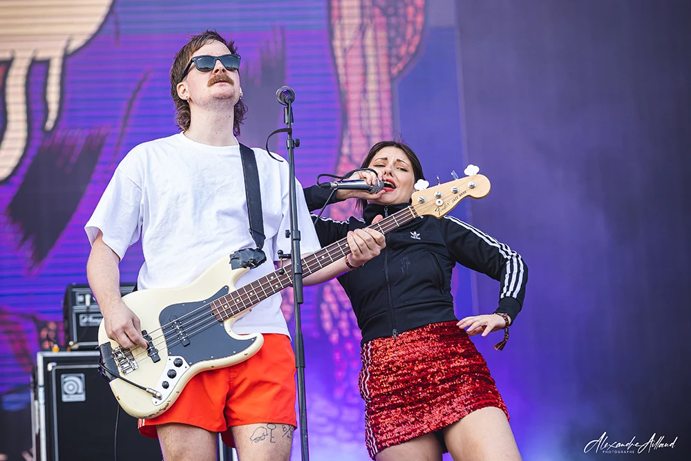À l’heure où certains profitent déjà de leur pause déjeuner, la Mainstage 2 se transforme en terrain de jeu survolté grâce aux Norvégiens de BLOOD COMMAND. Leur style ? Un improbable mélange de Punk, Hardcore et Pop sucrée, le tout badigeonné d’une esthétique « Adidas-core » assumée. Entre les survêtements flashy et les chaussettes montantes, la marque aux trois bandes est presque une seconde peau, incarnée à merveille par Nikki Brumen. La frontwoman australienne débarque vêtue d’une robe rouge à paillettes aussi scintillante que son énergie est explosive. Dès les premières secondes, elle est partout : surexcitée, bondissante, exigeant des circle pits, des walls of death et une énergie totale du public.