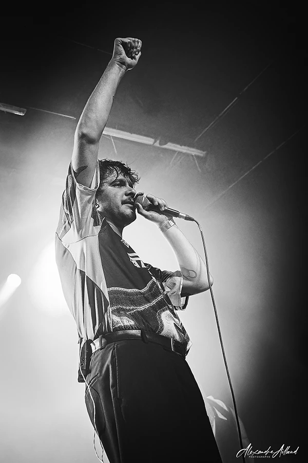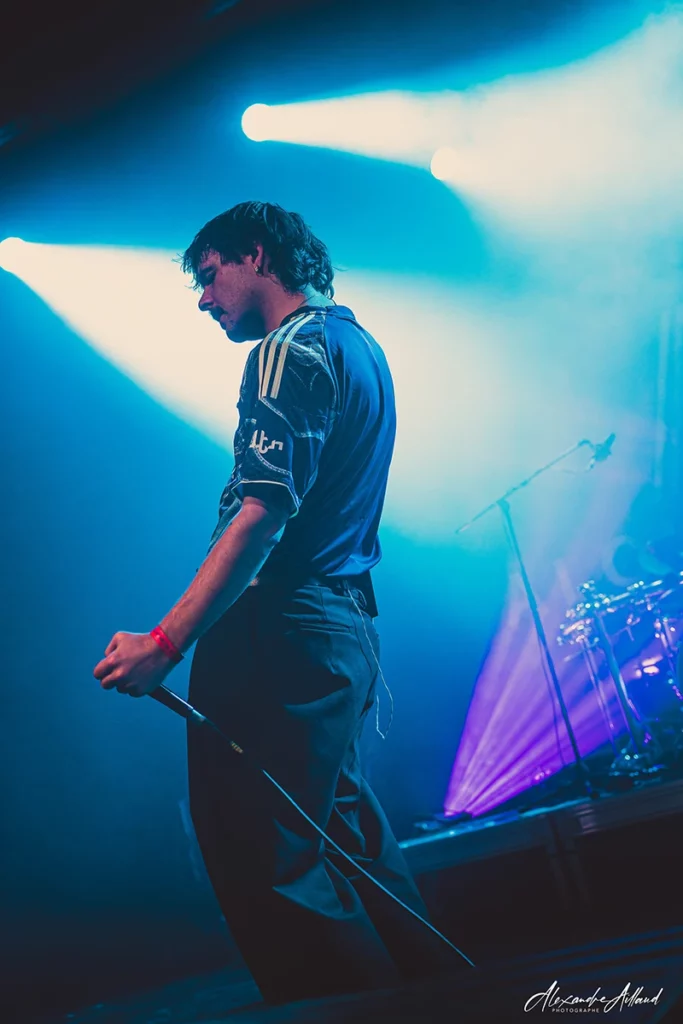 Après un court temps de récupération, car deux premiers sets ça laisse des traces, les lumières s’éteignent de nouveau. La salle plonge dans une pénombre bleutée. Et là… surprise totale. Les premières notes de « Désenchantée » de Mylène Farmer résonnent dans la Salle du Grès. Incrédulité générale, puis sourires, puis rires… et enfin un chœur massif qui hurle sur le refrain « Tout est chaos ! » Pendant que le public chante à pleins poumons, les quatre Lausannois montent sur scène. Thomas, debout derrière sa batterie, lunettes rondes à la John Lennon sur le nez, pointe la foule de sa baguette en rythme. L’ambiance est posée. Quelques secondes plus tard, fini de rigoler. « Flamel« , premier titre de leur album Chapter one : Love, démarre et la claque est immédiate.