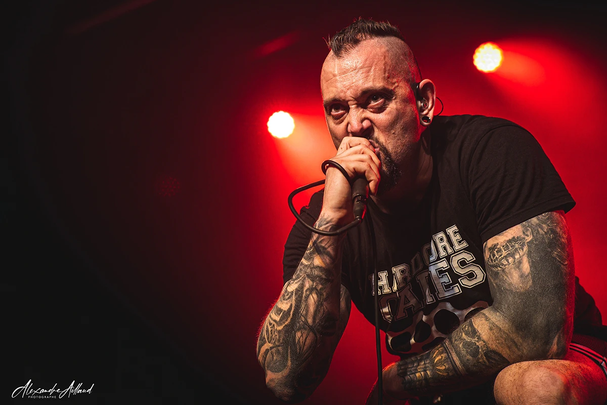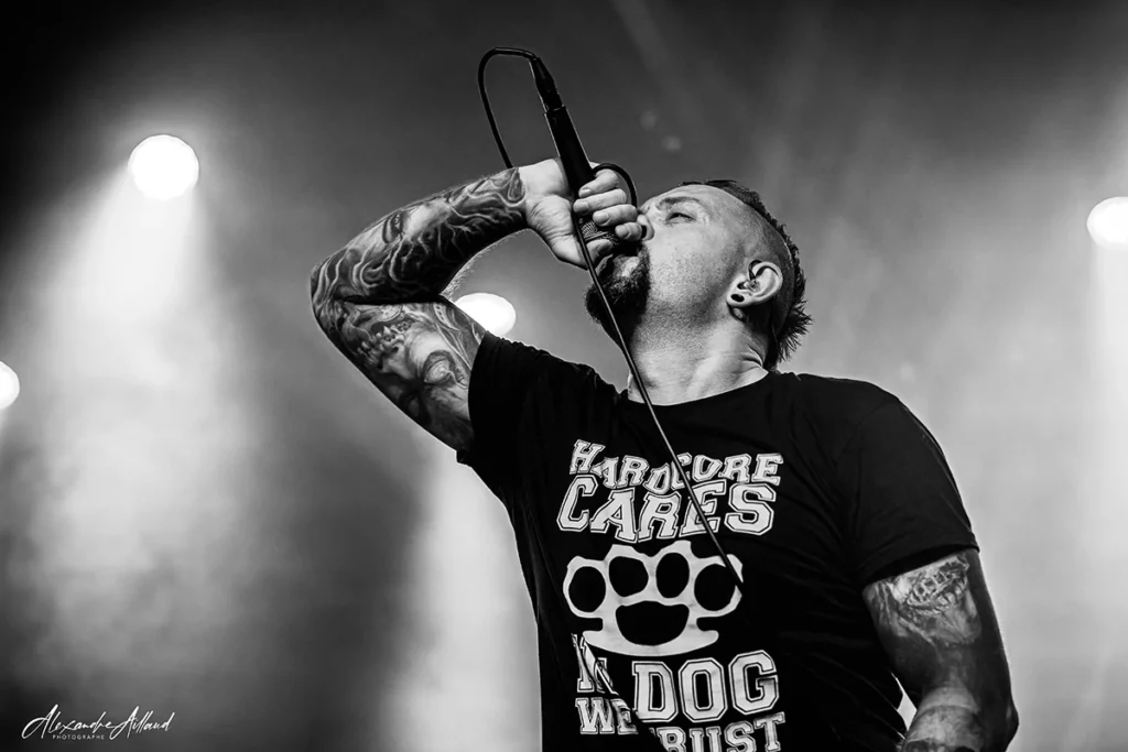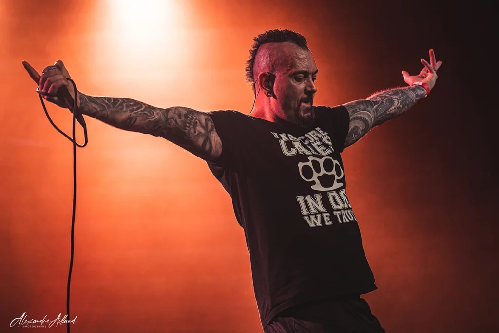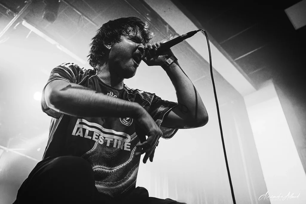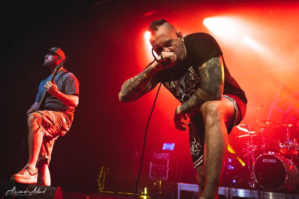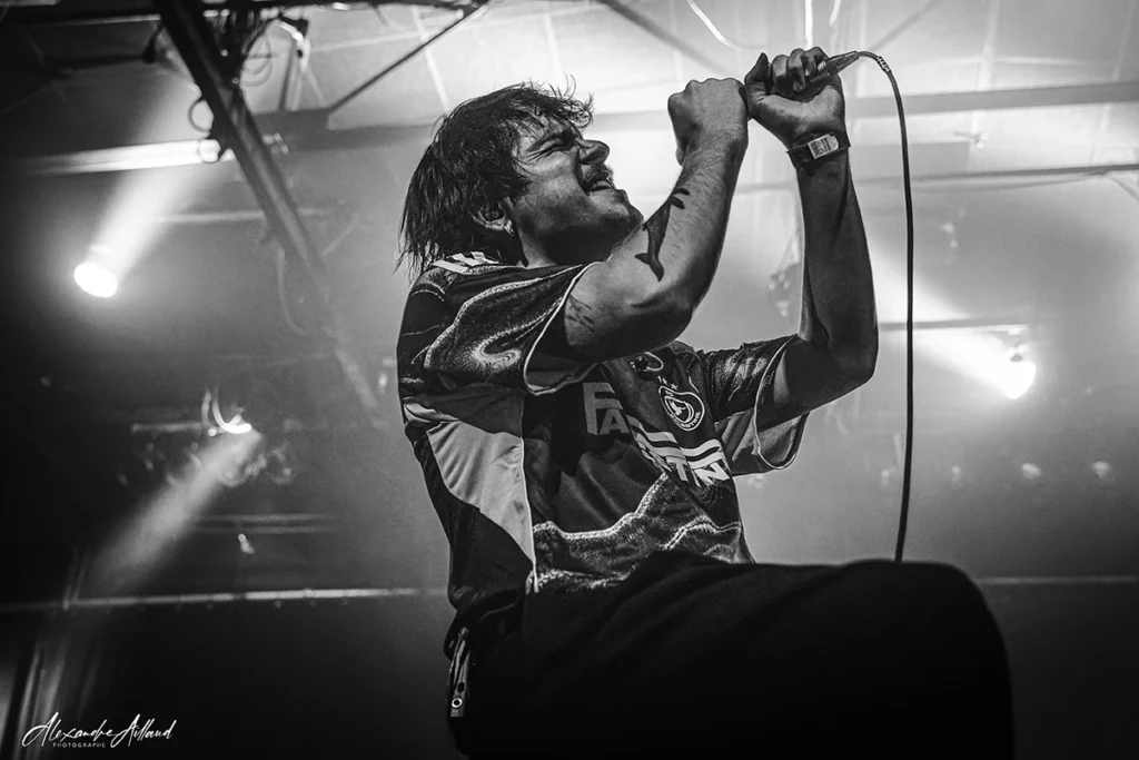 Au centre du chaos : Nonow. T-shirt « Hardcore Cares » sur le dos, iroquoise fièrement dressée et surtout une énergie incontrôlable. Une boule de nerfs qui harangue la foule, la pousse, la chauffe, la provoque presque. À ses côtés, Guillaume à la guitare, Matt à la basse et Ben derrière les fûts assurent la charpente sonore en mode rouleau compresseur. Dès les premières minutes, « Immolé » et « Dope » prennent une ampleur nouvelle en live. Puis vient le moment clin d’œil : un medley des influences du groupe, lancé par un « Blind » de Korn qui retourne instantanément la salle. Dédicace appuyée à Mélodie de Ghetto Paradise, grande fan du groupe et sourire complice en prime.