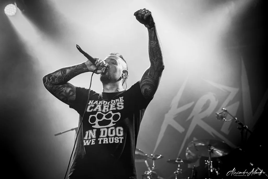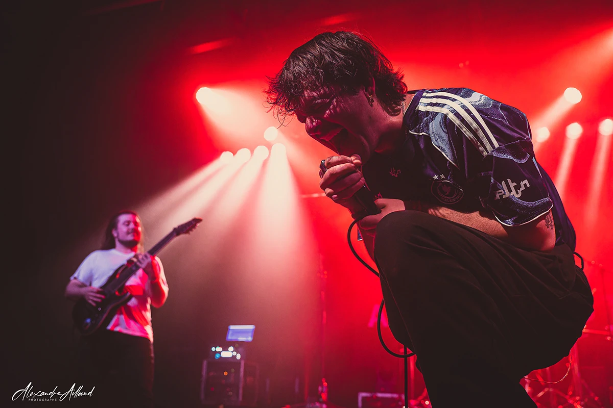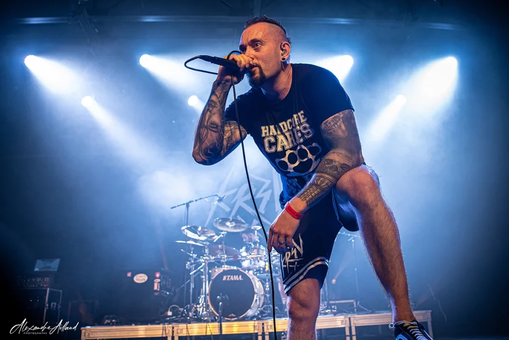 Quatre silhouettes débarquent sur scène et sans préambule KR3V appuie sur le bouton rouge. Mélange nerveux de Hardcore et de Metalcore, riffs massifs, batterie qui cogne sec : la décharge est immédiate.