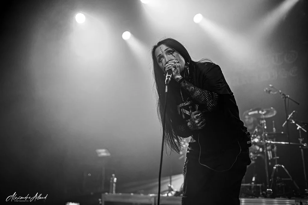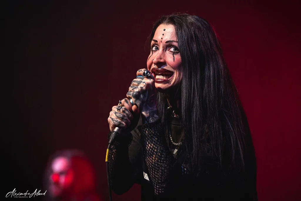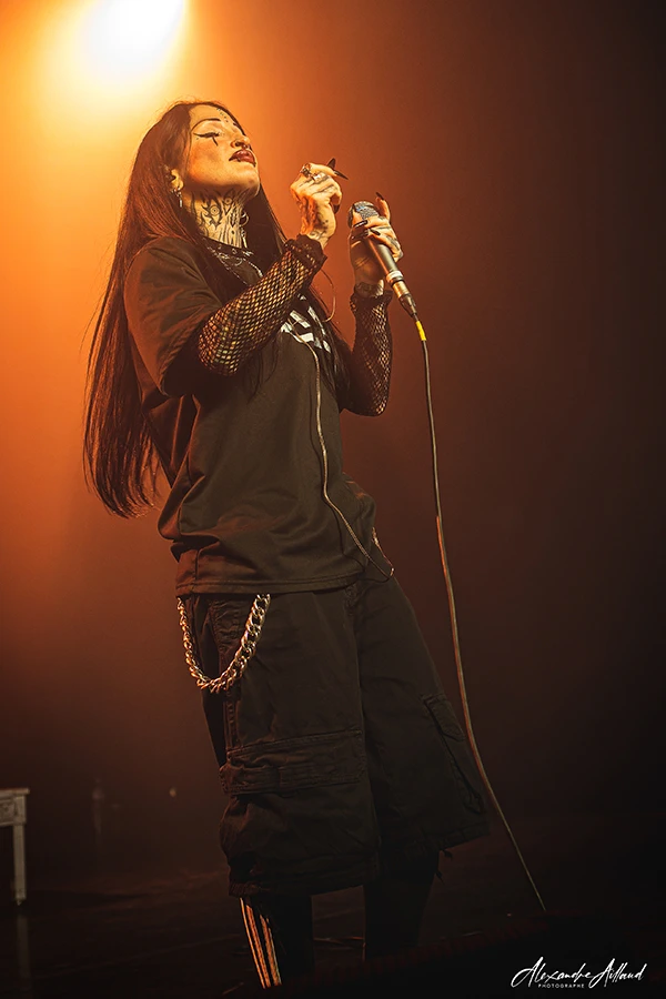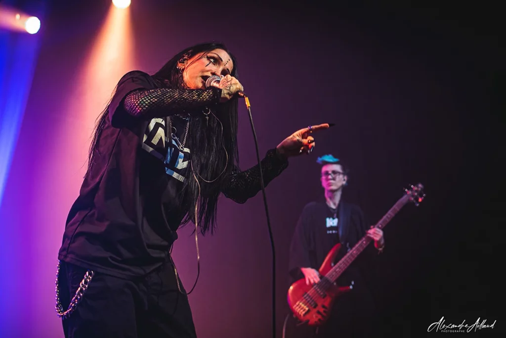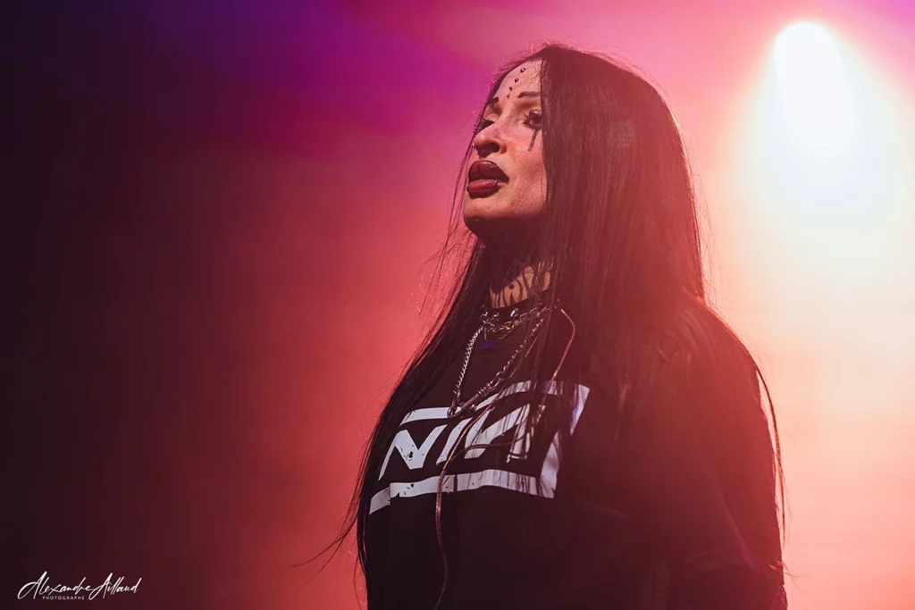 Puis vient le moment frisson. Après « Weight of silence« , mon titre préféré, le groupe balance la reprise « Falling away from me » de KORN. Forcément, la salle réagit au quart de tour. Dans la gestuelle de Mélodie, on retrouve quelque chose de Jonathan Davis : cette manière d’être traversée par le morceau plus que de simplement l’interpréter. La musique, chez elle, ne se joue pas : elle se vit ! De leurs côtés, Clément, Camille et Mathias assurent derrière avec une énergie sans faille. Et comme si ça ne suffisait pas, GHETTO PARADISE remet une pièce en fin de set avec « My own summer » de DEFTONES. Deux jours après le passage des Californiens à l’Adidas Arena de Paris à guichet fermé, le clin d’œil fait mouche. Le riff fait plier les nuques, le refrain est hurlé à pleins poumons, les barrières tremblent, résistent mais tiennent bon.